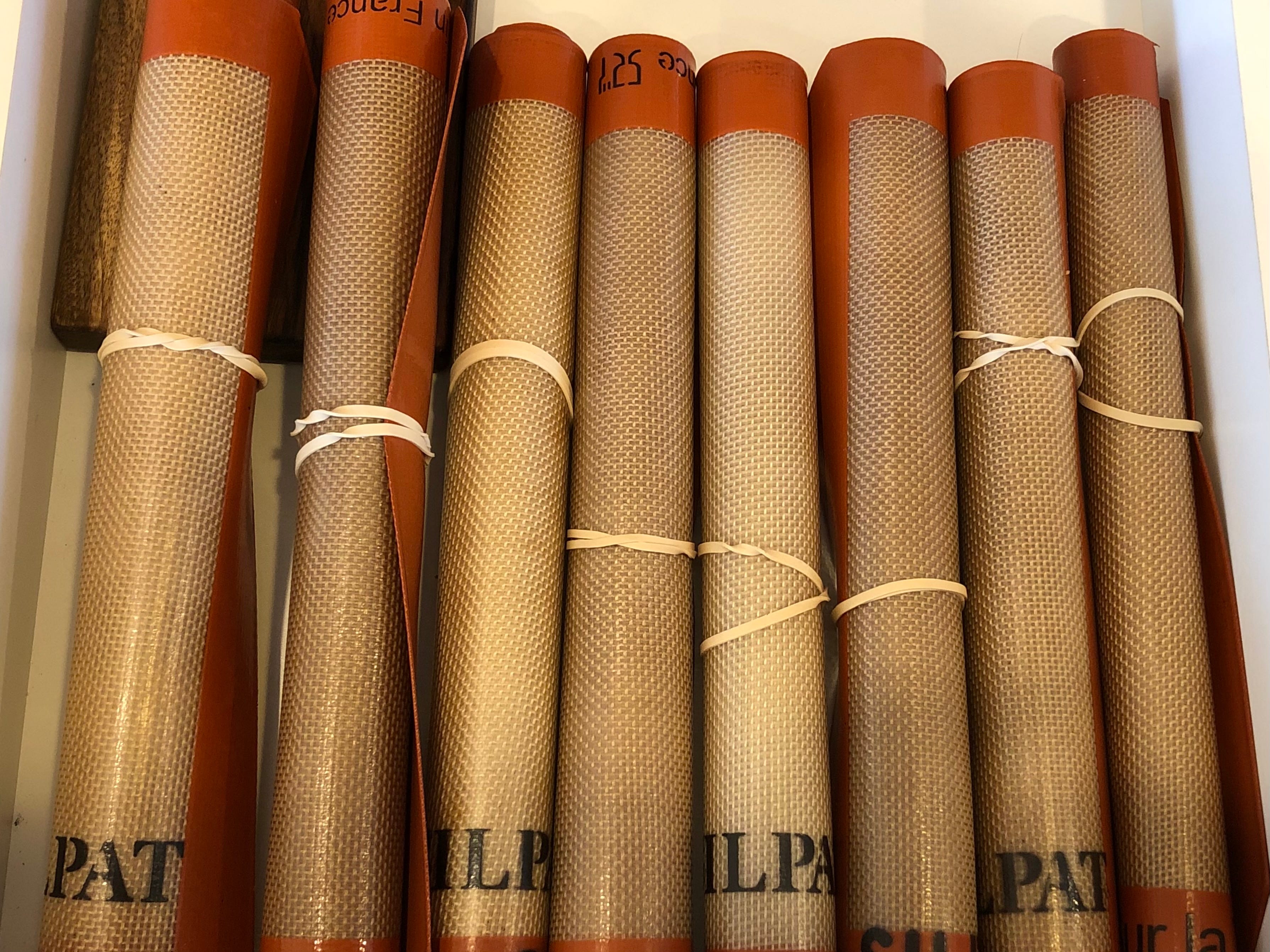Parchment Paper: Parchment paper is a great substitute for a Silpat mat. I recommend that you have both Silpat mats and parchment paper in your kitchen tool arsenal. Parchment works well for cookies that might lift up from a Silpat mat (stamping cookies for example), you can use it to roll out cookie dough and separate the stacks in the fridge. If you are worried about cross-contamination, being able to toss out a piece of parchment paper between cookie batches is the way to go. Beyond baking, it’s great to line a baking sheet to roast vegetables, fish, etc. I buy pre-cut sheets that exactly fit my half sheet pans. You can get them quantities of 100 or even 1000.